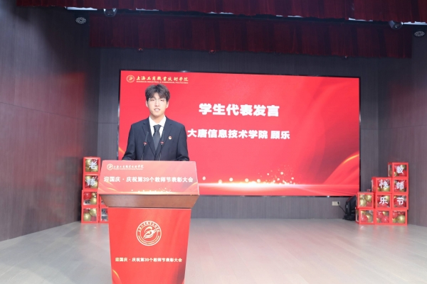 大唐信息技术学院顾乐作为学生代表发言,表达了对老师们的诚挚祝福与由衷感谢,他回顾在工商学习生活和成长历程,感谢老师们悉心指导与专业引领,给予他逐梦力量。