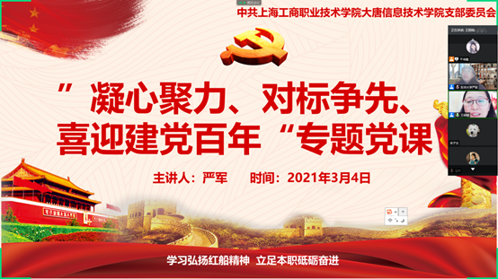 为深入学习贯彻习近平新时代中国特色社会主义思想,落实“三会一课”制度,以实际行动迎接建党100周年。大唐信息技术学院党支部于2020年3月4日16:30在腾讯会议线上开展了“凝心聚力,对标争先,喜迎建党百年”专题党课,本次党课邀请东华大学严军副教授主讲,全体党员参加。