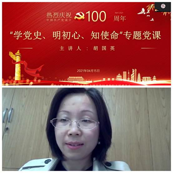 为落实习近平总书记在党史学习教育动员会上的重要讲话精神,引导我院党员、入党积极分子从党史中感悟真理的力量,做到学史明理、学史增信、学史崇德、学史力行,大唐信息技术学院党支部于2021415日在腾讯会议线上开展了“学党史、明初心、知使命”专题党课,党课由东华大学副教授胡国英主讲。