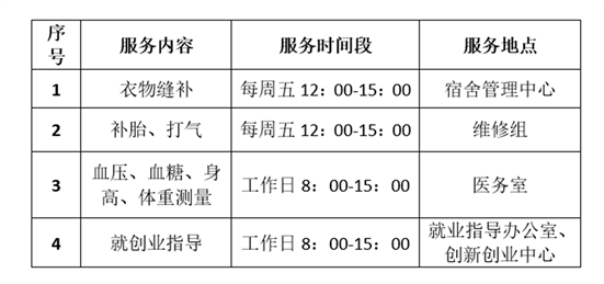 在广大师生的积极参与和支持下,两天的志愿服务活动得到的积极相应,经统计共计300多人次参加了支部组织的志愿服务活动,同时也得到了师生的一致认可,很多学生提到希望学校能经常性的组织这类公益活动。为持续推进支部“我为群众办实事”活动,切实帮助师生、教职员工解决存在的实际困难,特结合支部各块工作特点,在本次主题活动日结束后,将部分服务活动进行常态化推进,分别在后勤保卫处、招生就业办公室、创新创业中心各块设置相应服务点,具体如下: