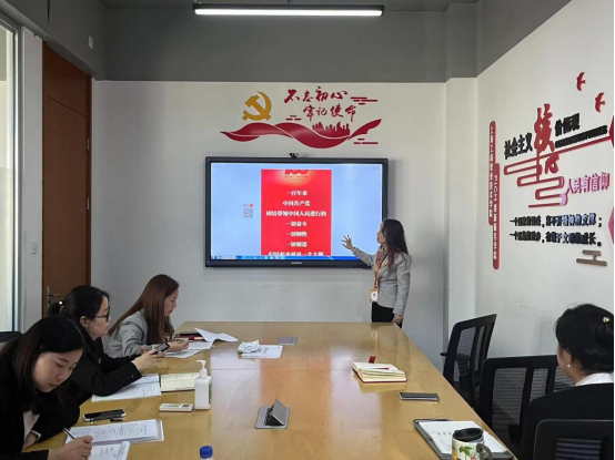 习近平总书记“七一”重要讲话立足中国共产党百年华诞的重大时刻和“两个一百年”历史交汇的关键节点,是一篇马克思主义纲领性文献,是新时代中国共产党人不忘初心、牢记使命的政治宣言,是我们党团结带领人民以史为鉴、开创未来的行动指南。党支部书记朱燕说到,党员要以习近平总书记重要讲话精神为根本遵循,牢记使命,立足本职,攻坚克难,锐意进取,肩负起时代赋予的重任。