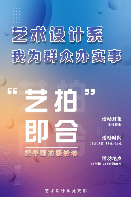 为进一步发挥党员先锋模范作用,不断增强党的向心力、凝聚力和战斗力,丰富支部党建形式,发挥支部党员专业特长,坚持实践导向、做到学史力行,提升服务群众的宗旨意识,艺术设计系党支部组织开展了“‘艺’拍即合,我为群众办实事——证件照拍摄”活动。此次拍摄活动自12月10日下午12点-14点于28号楼202摄影教室开展。