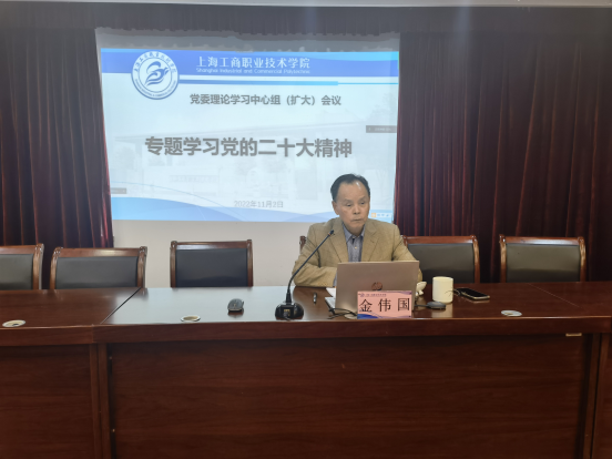 11月2日下午,学校党委在嘉定校区北楼报告厅召开党委理论学习中心组(扩大)会议,专题学习党的二十大精神,党委书记金伟国主持会议,传达了10月26日上海教育卫生系统学习宣传贯彻党的二十大精神大会的会议精神,并就深入学习宣传贯彻党的二十大精神进行部署。学校党委副书记张中美、副校长王中强、副校长李向明出席。
